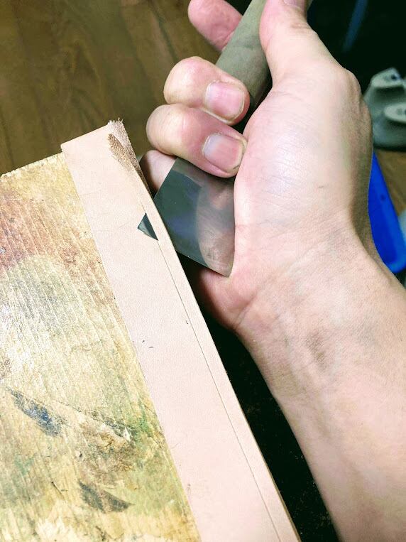 ウェルト(靴の周りを縁取るように甲革と本底に縫い付ける)の作成。
