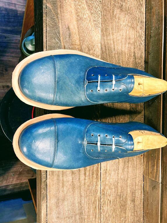 靴に使用した牛革はHi-COLORで何度も藍染(天然灰汁醗酵建て)を重ねました。